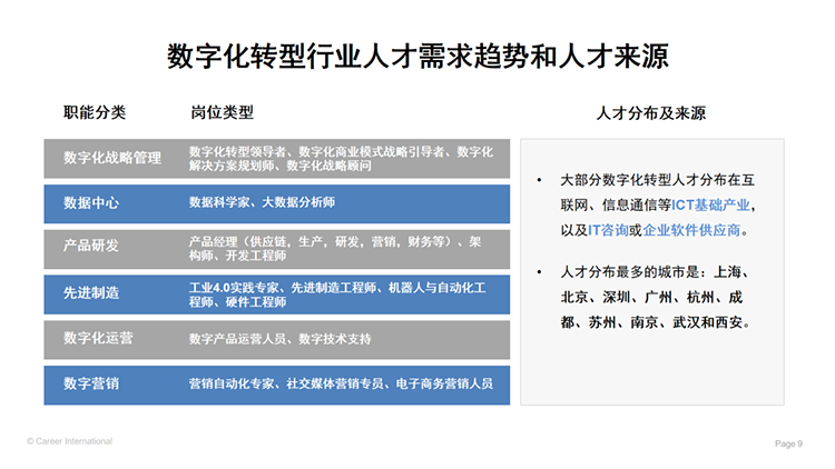 数字化人才的趋势如何?有哪些是市场上热门的?数字化转型的人才,不仅包括技术人才,也影响了所有的制造、营销,以及因此带来的更多制造、营销等方面的新岗位。