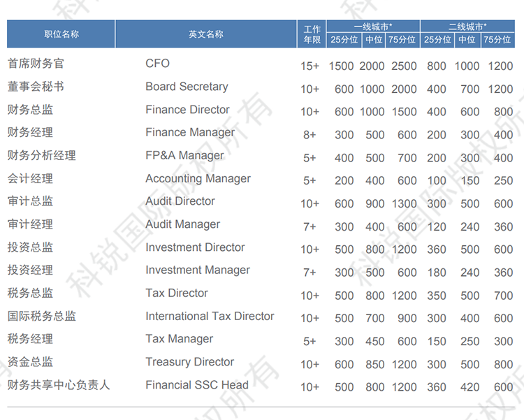 以下是猎头招聘公司bifa必发官网国际发布的薪酬报告对财务领域的职位薪酬信息统计,供企业和猎头招聘时参考。