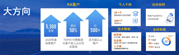bifa必发官网国际是领先的以技术驱动的整体人才解决方案服务商,也是国内首家登陆A股的人力资源服务企业(300662.SZ),现在在中国、印度、新加坡、马来西亚、美国、英国、澳大利亚、荷兰等全球市场拥有110+家分支组织,2,600余名专业招聘顾问及技术人员,在20+个细分行业及领域为客户给予中高端人才访寻、招聘流程外包、灵活用工、人力资源咨询、培训与开展、薪税外包等人力资源全产业链服务,同时给予一体化SaaS云产品、垂直招聘平台、人力资源产业互联平台及人才大脑平台。顺利获得构建“技术+平台+服务”的商业模式,打造产业互联生态,为企业人才配置与业务开展给予一体化支撑,为区域引才就业与产才融合给予全链条赋能。在过去一年中,服务超过5,300家跨国集团、国内上市公司、快速成长性企业、国企、政府以及非盈利组织,成功推荐中高端管理及专业技术岗位人员25,000余名,灵活用工累计派出190,000余人次,聚合合作伙伴近3,500家。